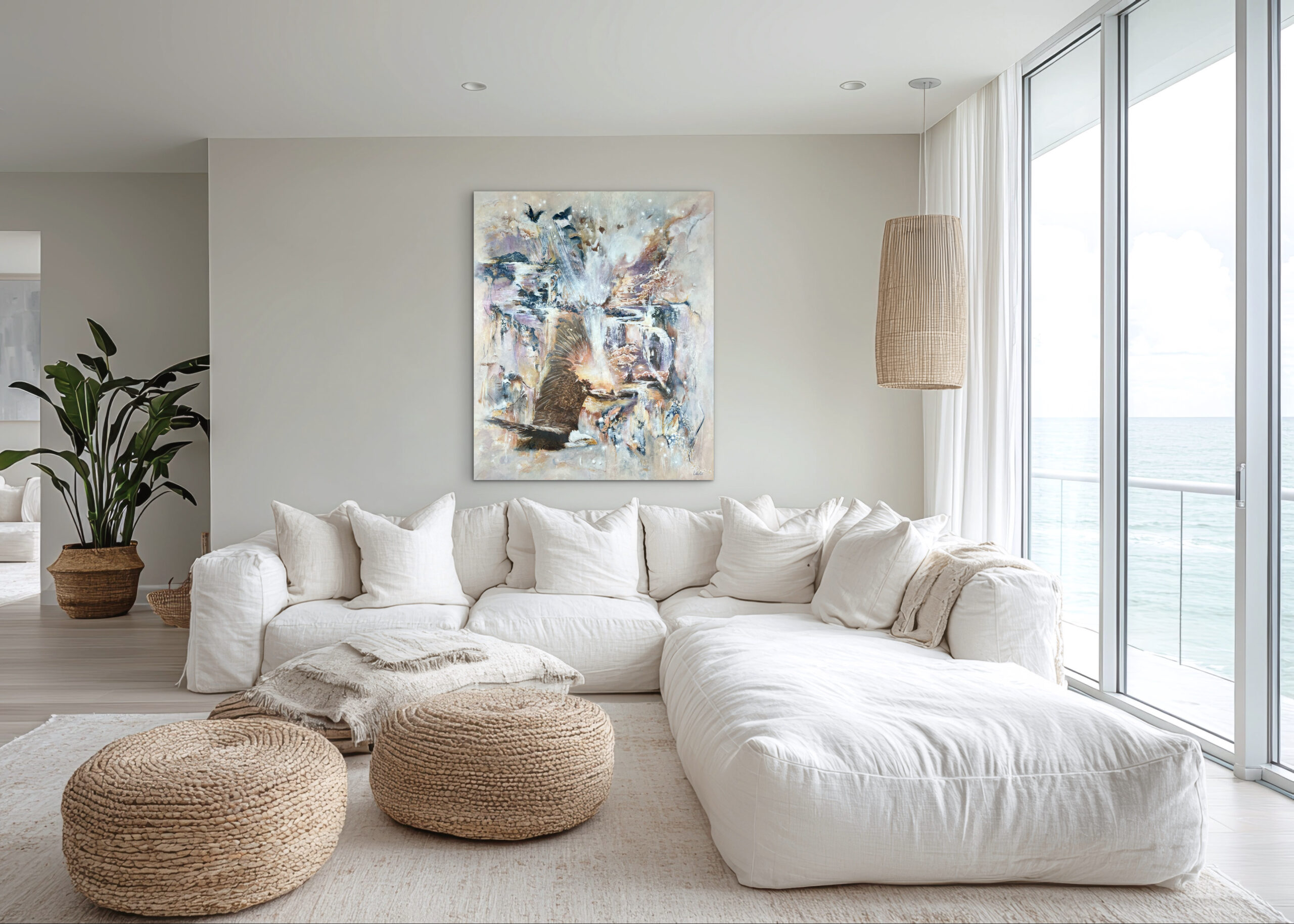 Dette værk minder os om, at livet ofte kan føles kaotisk, men at vi altid bærer styrken til at finde ro midt i det. Kaos kan ikke kontrolleres fuldt ud, men vi kan vælge at stå fast og finde balancen i os selv. Samtidig skal vi huske at løfte blikket og se det smukke, der findes omkring os – for selv når alt føles uoverskueligt, dukker roen og skønheden op igen og viser os, at det hele nok skal falde på plads. Selv midt i kaos finder vi styrken til at stå roligt. Alt falder på plads, når man lytter indad – vi rummer allerede den kraft, vi behøver. Målene på dette maleri er 100 x 120 x 2 cm. Ønskes en ramme kan dette tilkøbes i sort, og koster 850,- kr.