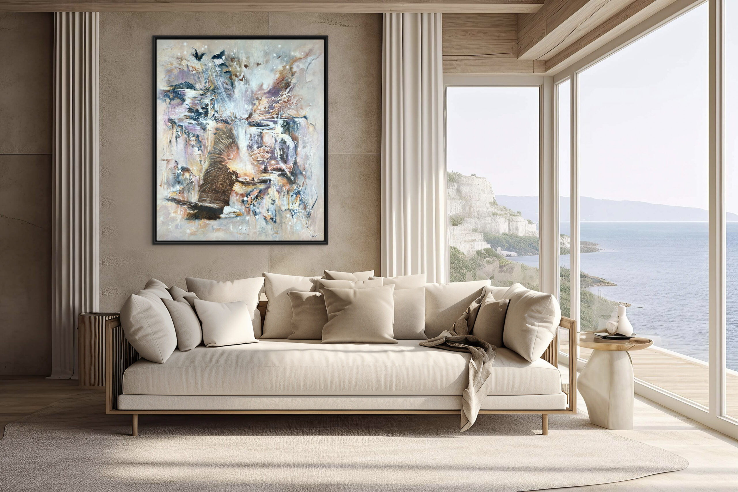 Dette kunstværk vækker fantasien og inviterer dig til at udforske en verden af muligheder, hvor du måske ser snelandskab, bjerge, fugle og andre inspirerende motiver. Den tilstedeværende hvide tåge bidrager til at skabe en følelse af blødhed i billedet. Maleriet er udført på et lærred med dimensionerne 100 cm x 120 cm x 2 cm og er malet i beroligende jordfarver, der skaber en atmosfære af ro og hygge. Disse naturlige farver er ideelle til at skabe et afstressende miljø i ethvert rum. Ønsker du at fuldende værket med en ramme, kan dette tilkøbes separat. Den tilhørende ramme er udført i silkemat sort og kan erhverves for 850 kr.