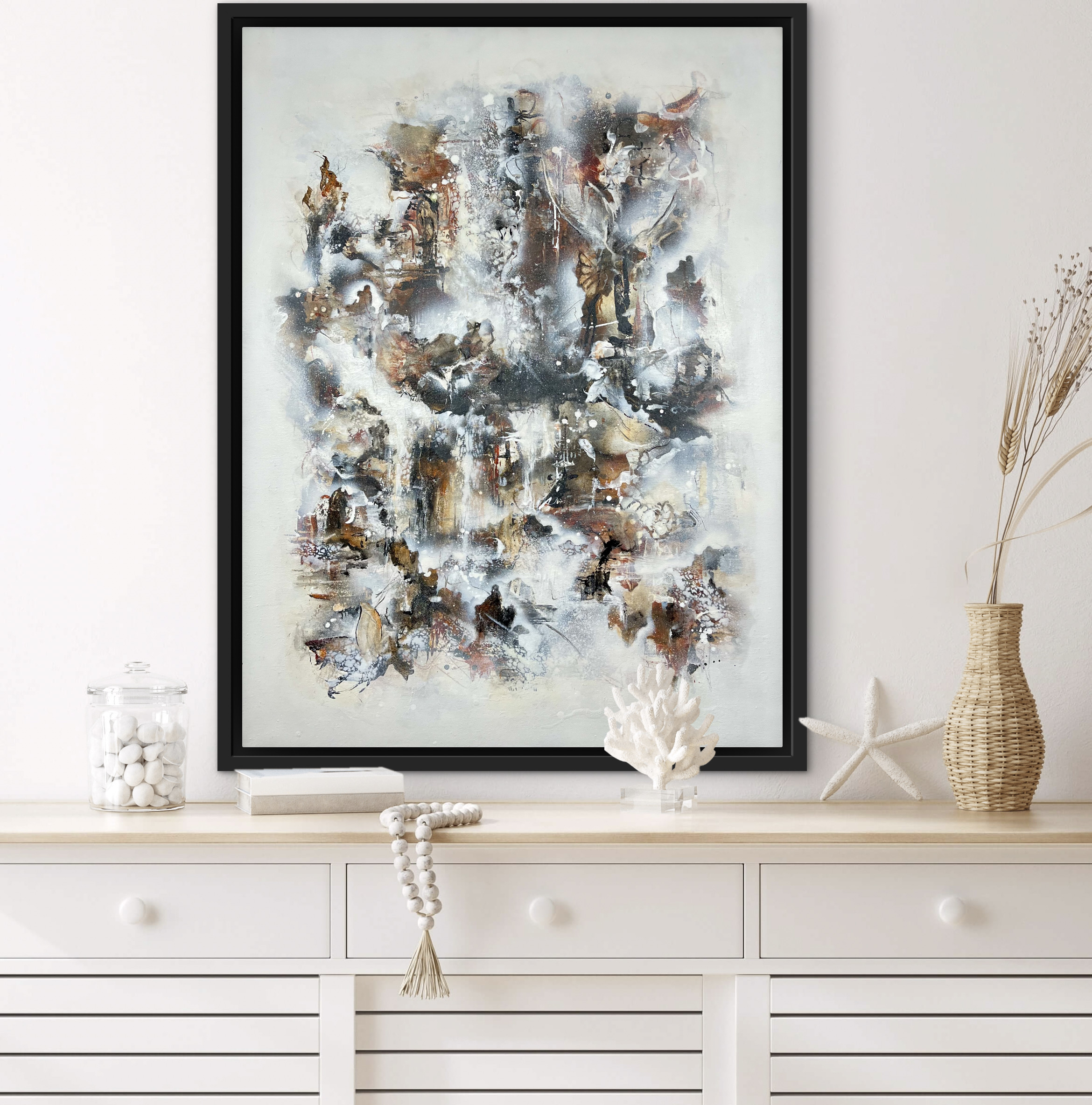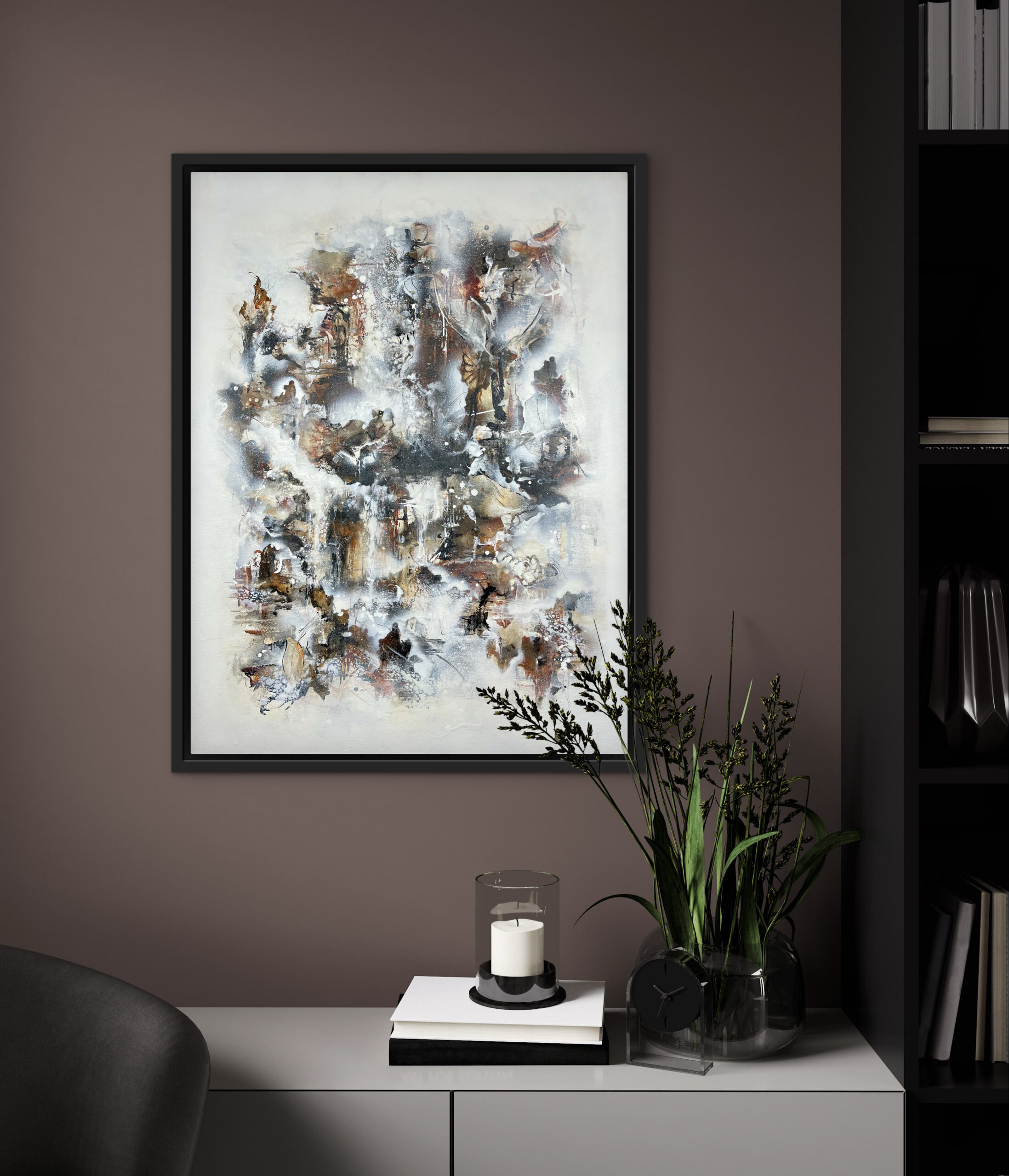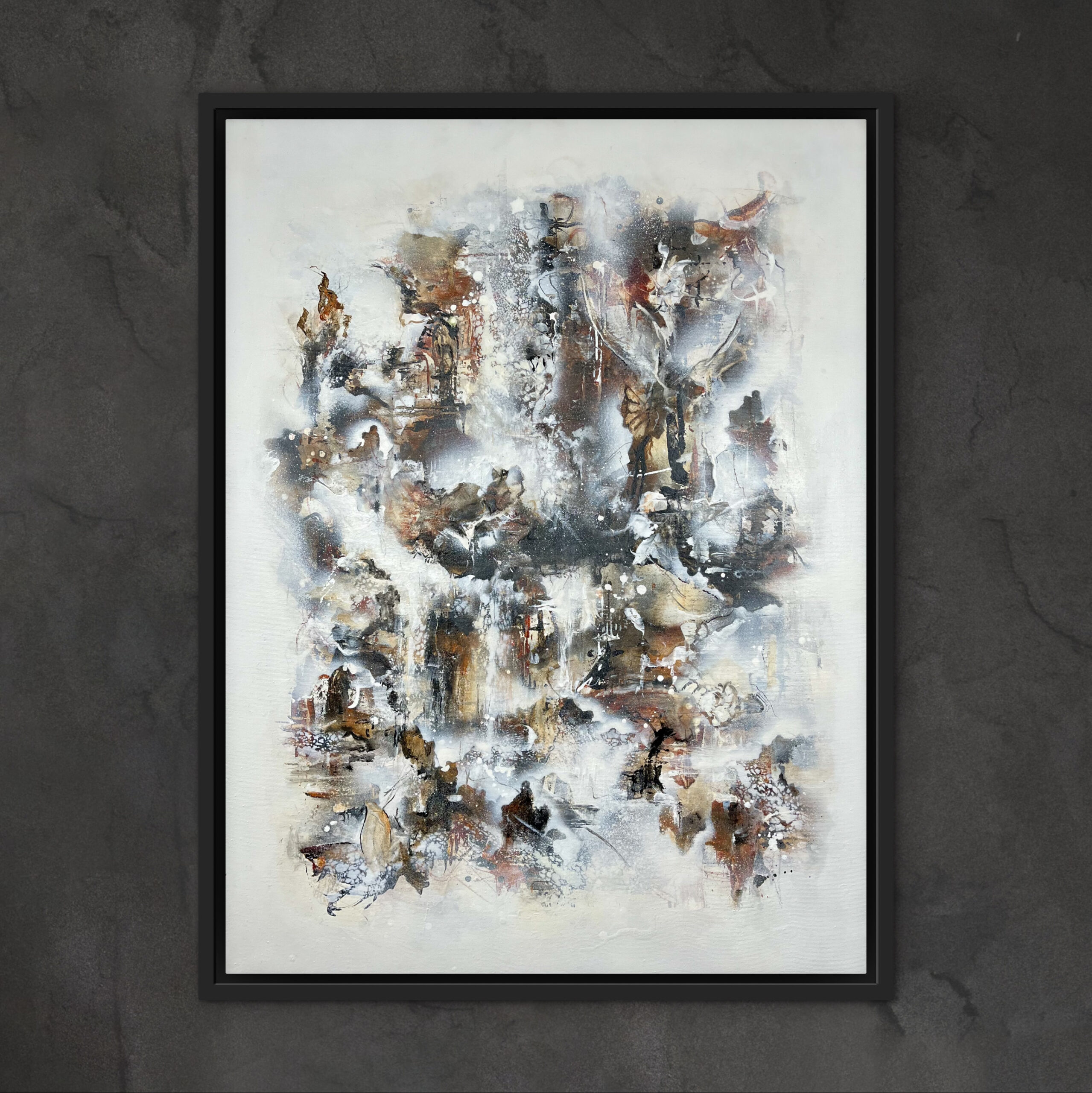 Dette billede, er malet på et lærred af størrelsen 60 cm. x 80 cm. x 2 cm. Det er malet i sort, hvid og Sienna. Sienna skaber et gyldent udseende, med en varm og rolig atmosfære, og er et godt valg til de rum, hvor du ønsker, at stemningen skal være afstressende og hyggelig. Ønsker du en ramme kan dette tilkøbes. Rammen er i silkemat sort, og koster 650,- kr.