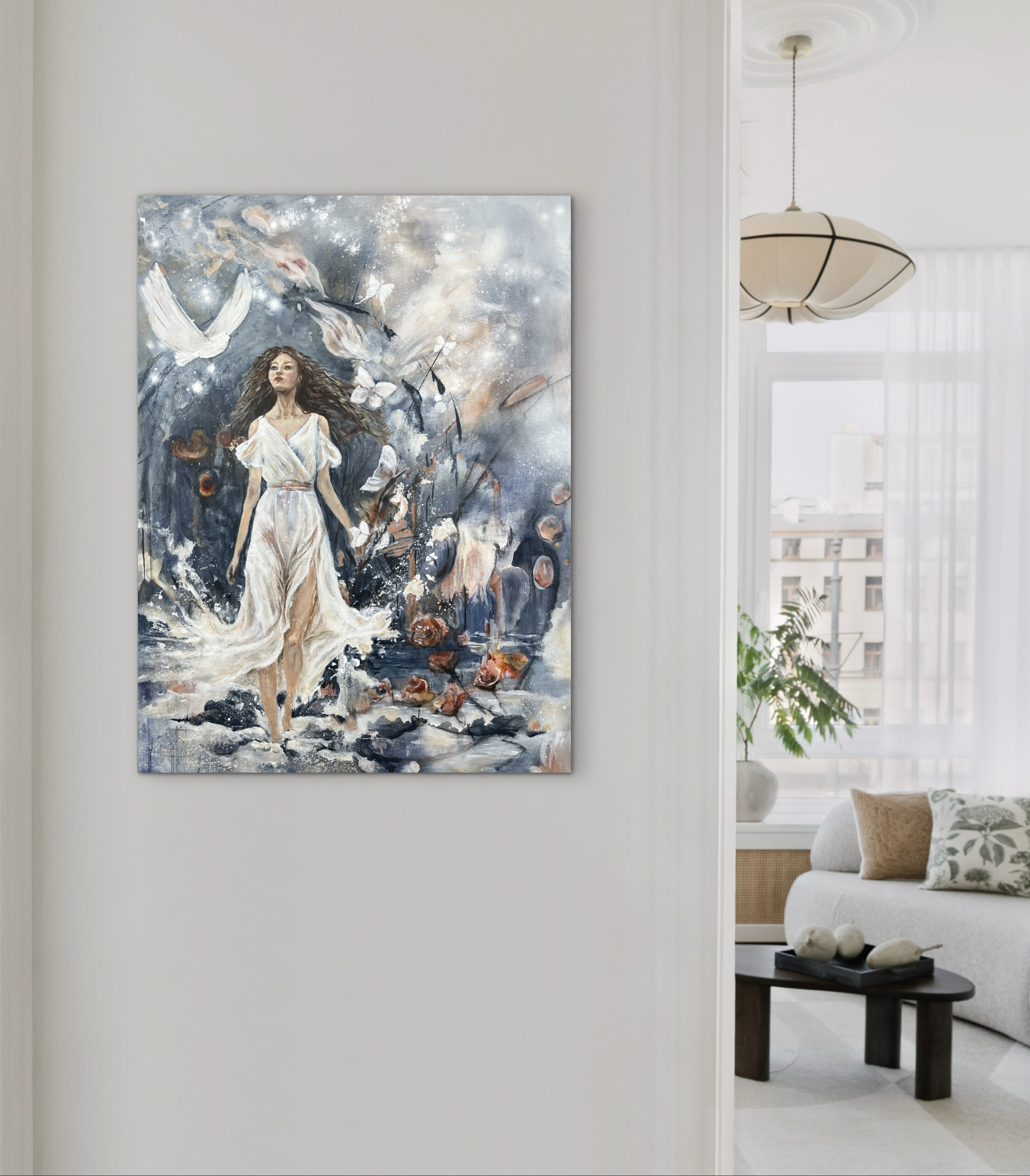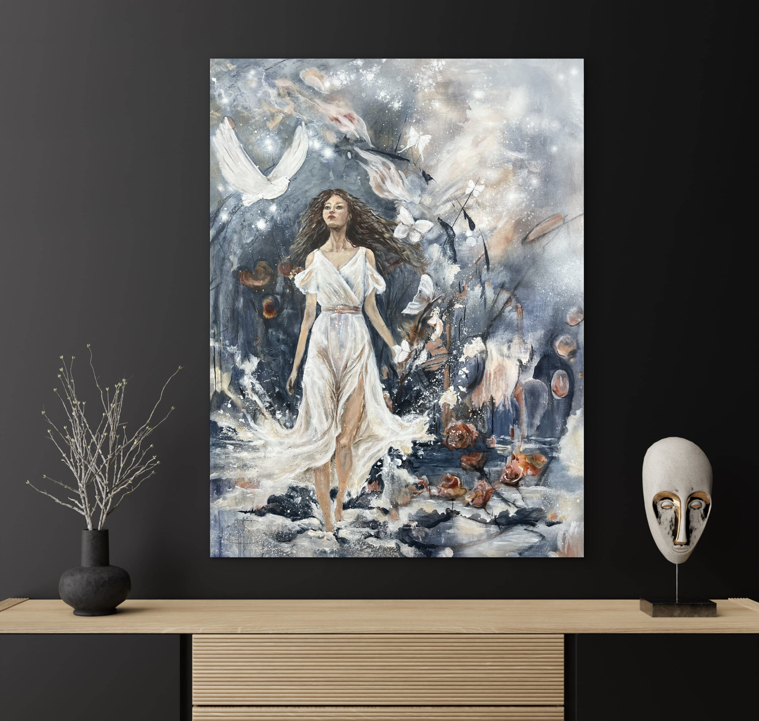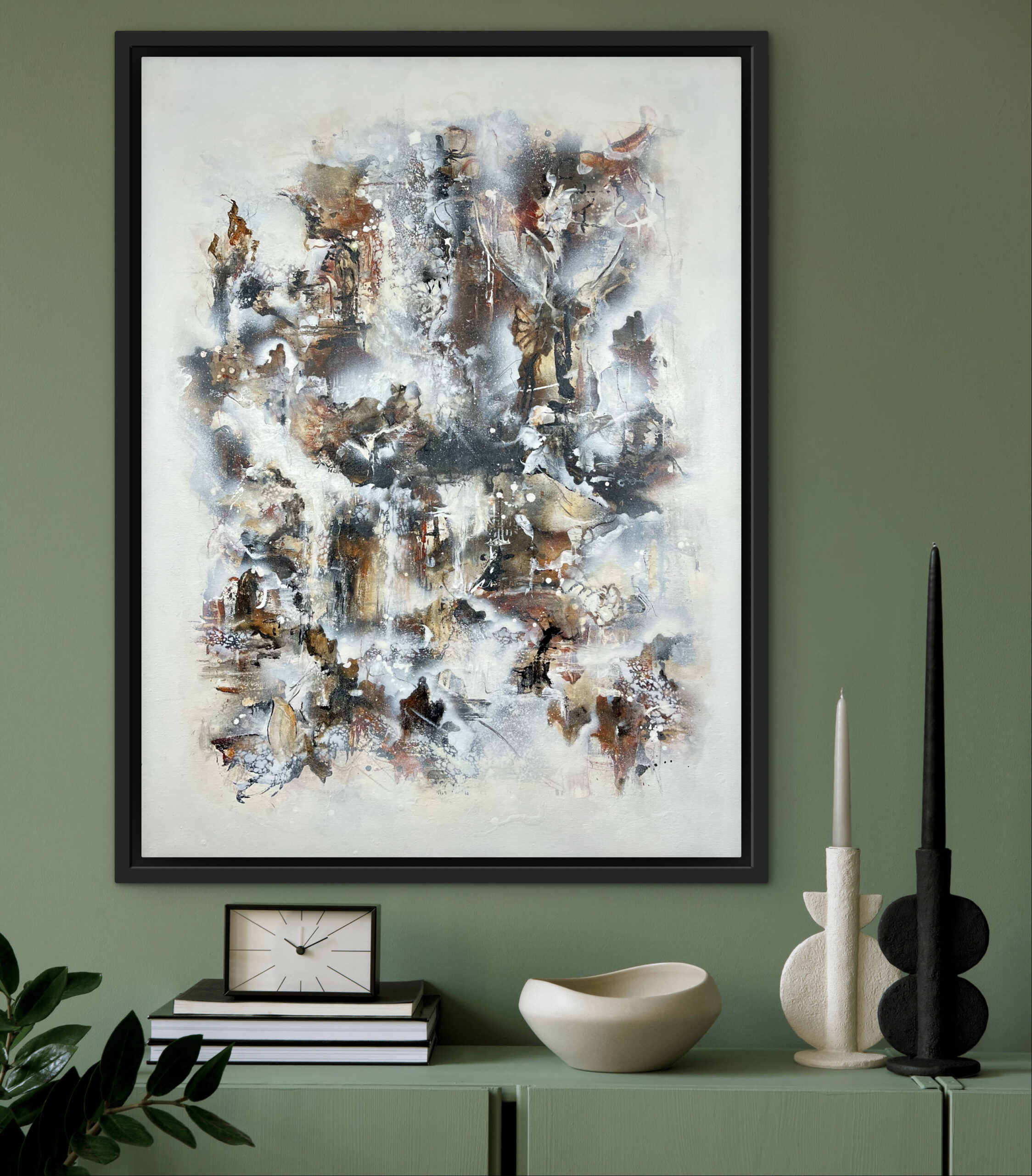 Dette billede, er malet på et lærred af størrelsen 60 cm. x 80 cm. x 2 cm. Det er malet i sort, hvid og Sienna. Sienna skaber et gyldent udseende, med en varm og rolig atmosfære, og er et godt valg til de rum, hvor du ønsker, at stemningen skal være afstressende og hyggelig. Ønsker du en ramme kan dette tilkøbes. Rammen er i silkemat sort, og koster 650,- kr.