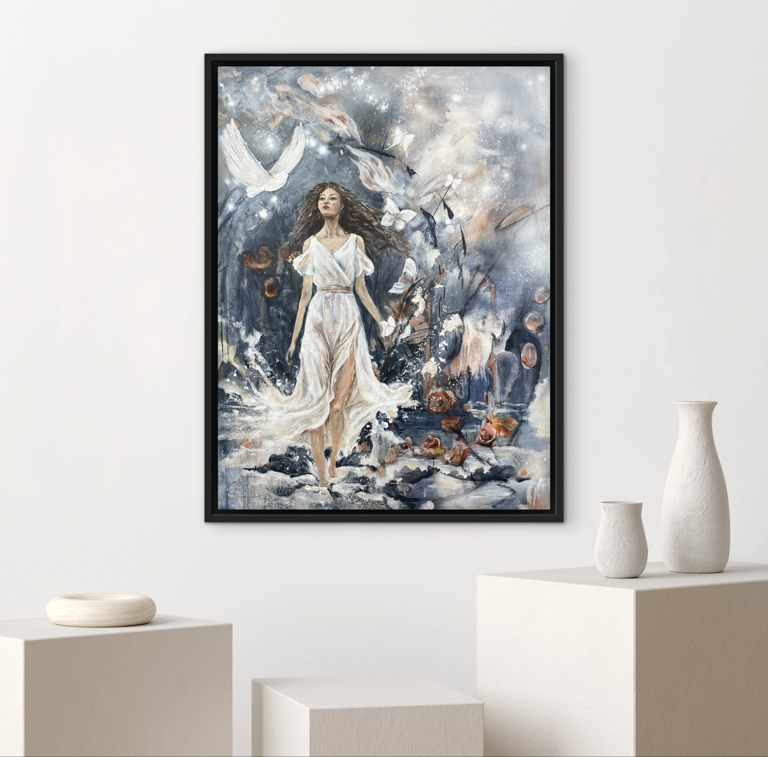 Rosa er et billede malet i mange farver. En blanding af støvede farver, kombineret med klare farver. Billedet besidder en blødhed trods de mange farver på grund af det støvede hvide slør. Billedet er malet på et lærred af størrelsen 60 cm. x 80 cm. x 2 cm. Ønsker du en ramme kan dette tilkøbes. Rammen er i silkemat sort, og koster 650,- kr.